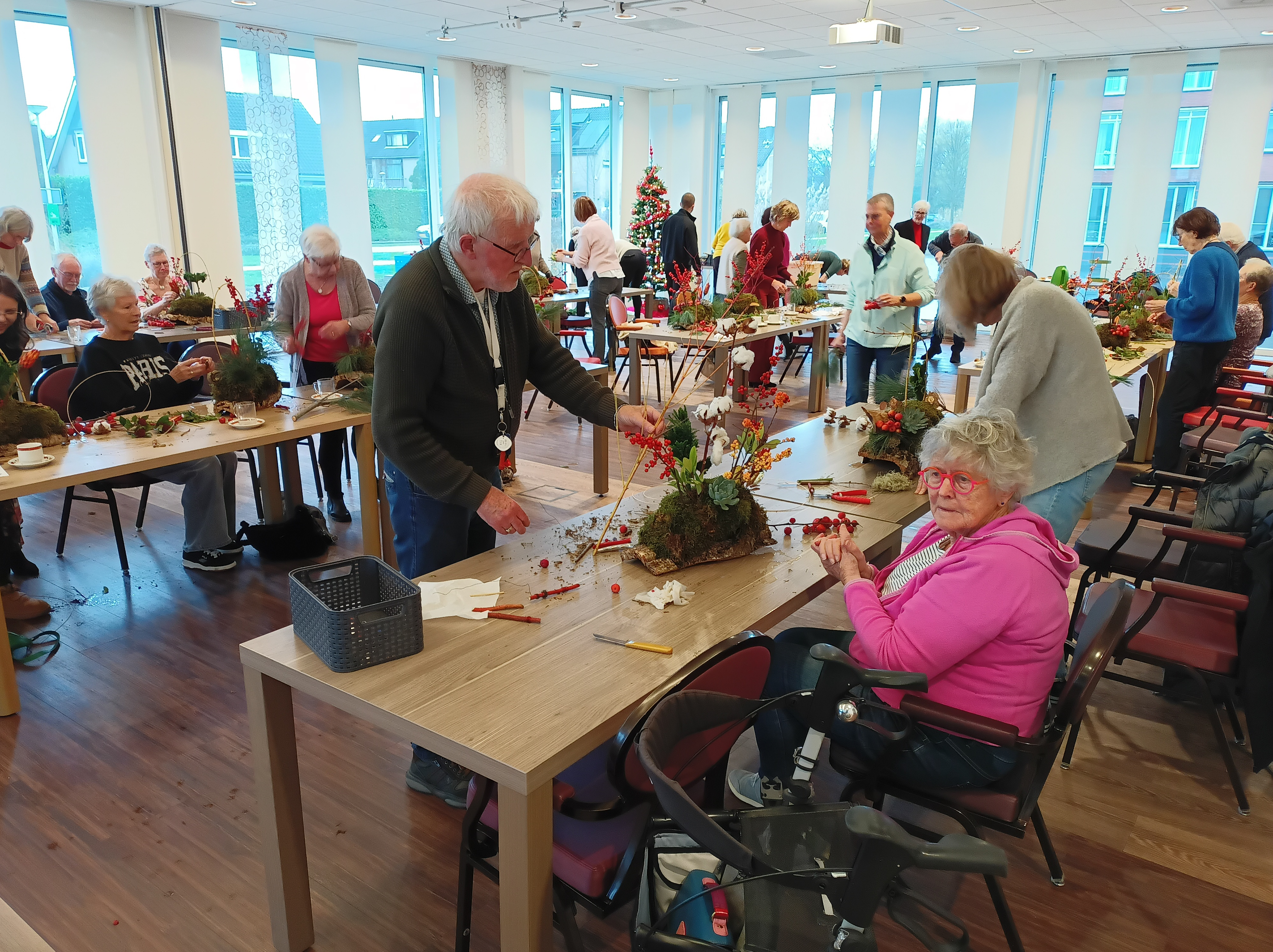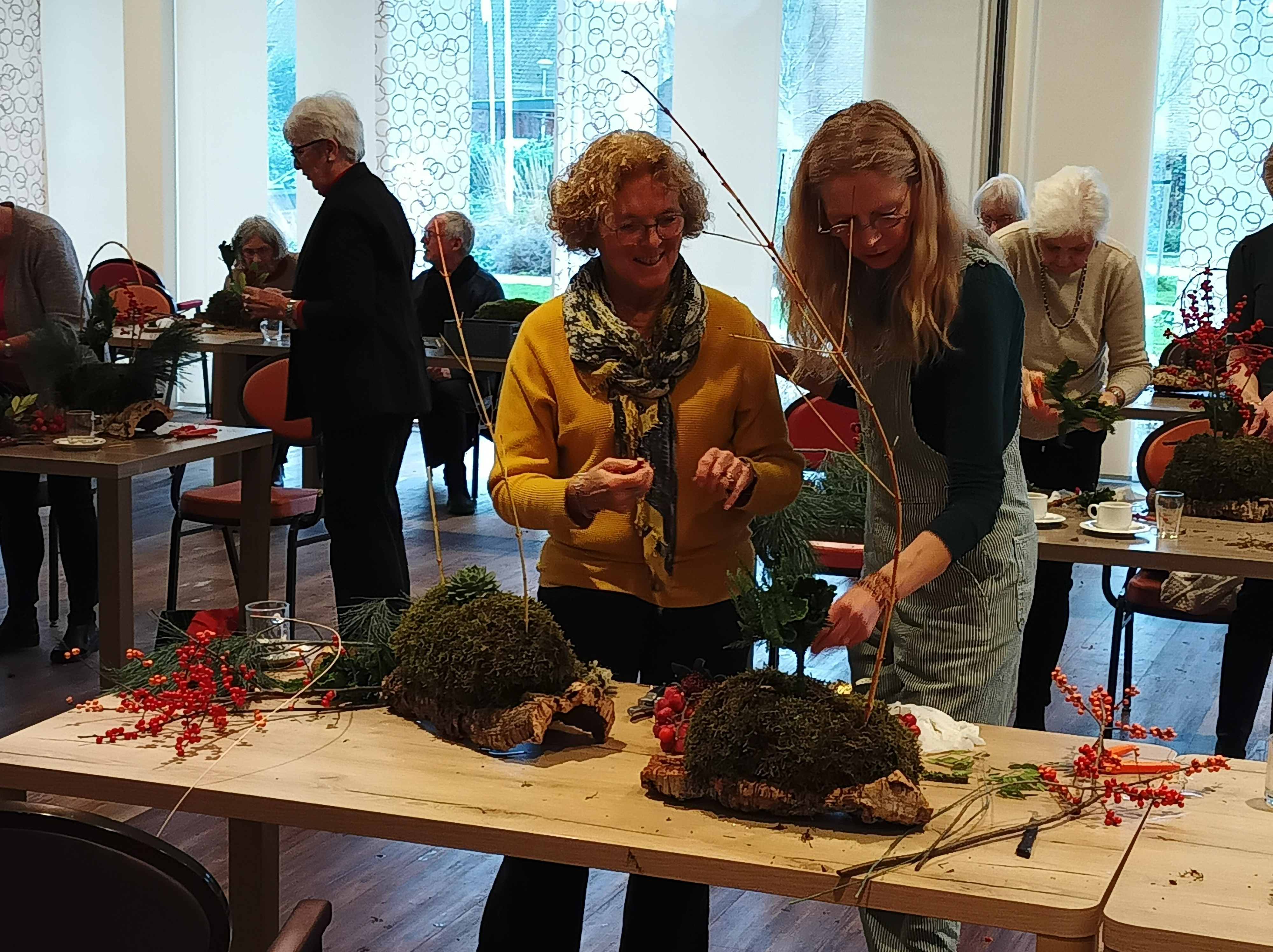 Na bijna twee uur werken leek de bekende zaal een ravage van lekwater, takjes en “verloren besjes”. Maar vele handen maken licht werk en toen iedereen trots met zijn/haar creatie naar huis ging, was de zaal weer als vanouds. Het rook er alleen nog heerlijk naar dennengroen!