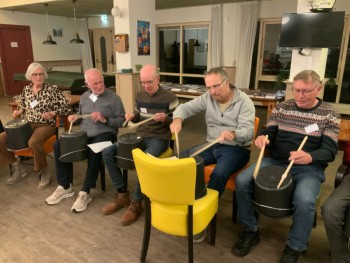 Riny deed enkele ritmes voor en bouwde de moeilijkheidsgraad langzaam op terwijl de groep hetzelfde ritme mocht nadoen. Dat was effe wennen..! Je moet namelijk tegelijkertijd bedenken met welke hand je slaat, op welke plaats je de emmer raakt en wanneer het moment is om te slaan. Drie momenten voor de prijs van één :) Aan het einde van de avond hadden we het goed te pakken en sloten we gezamenlijk en eensgezind met elkaar af. Uiteraard gaf Riny als sluitstuk nog een drumsolo. We hebben er van genoten!