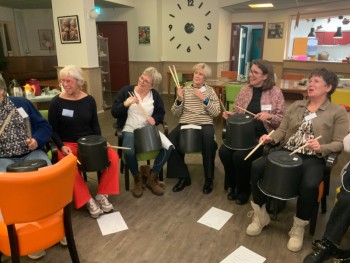 Riny bracht een stapel kunststof emmers en bijbehorende drumstokken mee om ons te laten proeven wat nu precies percussie spelen inhoudt. Wat het zeker betekent is dat het intzettend veel plezier geeft!
