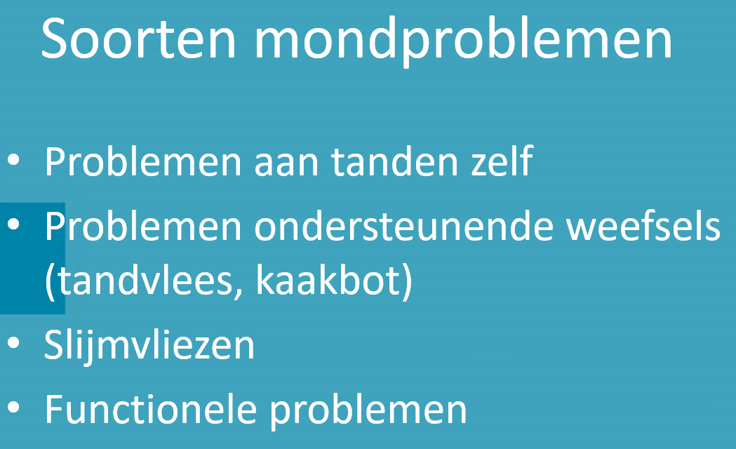 Na problemen met tanden werd ook besproken wat voor bijzondere aspecten de mondzorg met zich meebrengt: tanden poetsen, een tremor, stijfheid, etc. Ook problemen met poetsen als men 'Off' is.