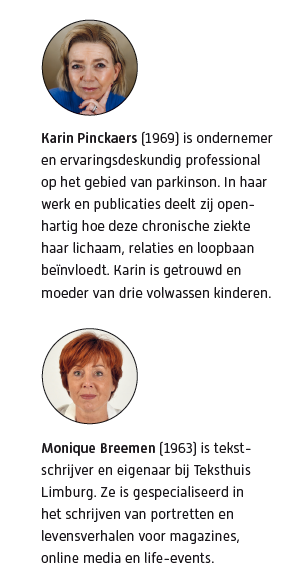 Als ondernemer is Karin gewend om vooruit te kijken en plannen te maken. Dat doet ze ook als het om haar ziekte gaat. Ze verdiept zich in de materie en besluit om zoveel mogelijk voor te sorteren op toekomstige klachten. Door intensief te sporten, ingrijpend anders te gaan eten, alternatieve therapieën uit te proberen en zichzelf nieuwe vaardigheden aan te leren, wil ze haar ziekte steeds een stap voor blijven. Jarenlang lukt dat, maar dan lijkt het erop dat de ziekte haar langzaam inhaalt. Maar Karin zou Karin niet zijn als ze niet op zoek bleef gaan naar oplossingen en lichtpuntjes. ‘Vooruit met die achteruitgang!’ is het verhaal van een sterke vrouw die open en eerlijk is over haar valkuilen en dieptepunten. Een vrouw die alles uit het leven haalt, blijft genieten en gelukkig is. Mét parkinson.