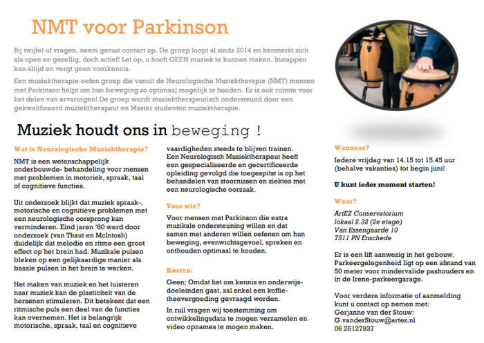 Gerjanne verzorgt samen met muziekstudenten op vrijdagmiddag van 14.15 uur tot 15.45 uur (behalve vakanties) deze NMT bijeenkomsten in ArtEZ Conservatorium lokaal 2.32 (2e etage) Van Essengaarde 10 7511