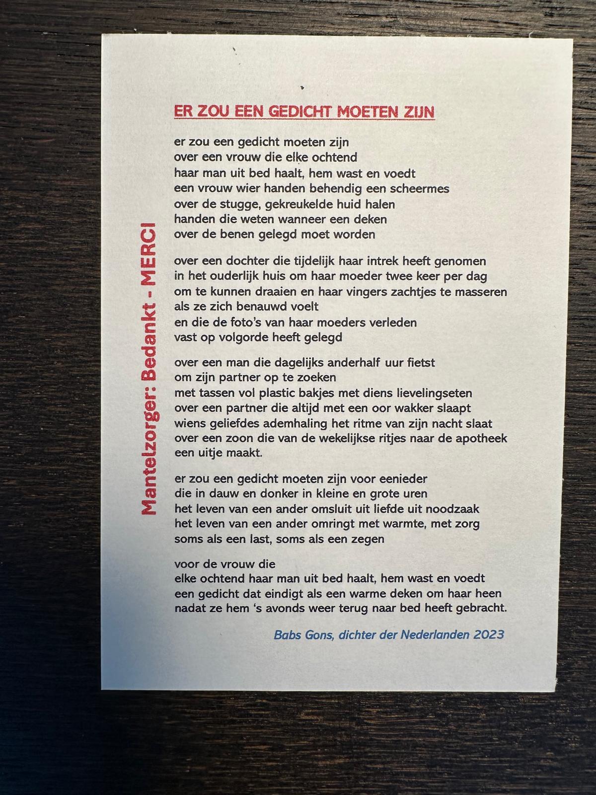 En tot slot werd er een prachtig gedicht van Babs Gons voorgedragen over het mantelzorg-schap. Deze is terug te vinden onder gekoppelde documenten.