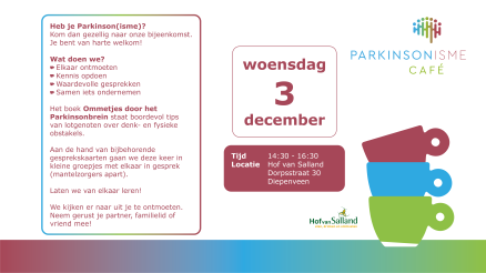 Het is een zelfhulpboek voor en door mensen met Parkinson en hun naasten en staat boordevol tips van lotgenoten over denk- en fysieke obstakels. Aan de hand van de bijbehorende gesprekskaarten gaan we deze middag in kleine groepen praktisch aan de slag en worden verschillende situaties doorgenomen. De mantelzorgers vormen aparte groepen. De gesprekken worden begeleid door zorgverleners die aangesloten zijn bij ParkinsonNet. Plaats van handeling: Hof van Salland, Dorpsstraat 30 te Diepenveen. Aanvang van de middag is 14.30 uur. U bent van harte uitgenodigd.