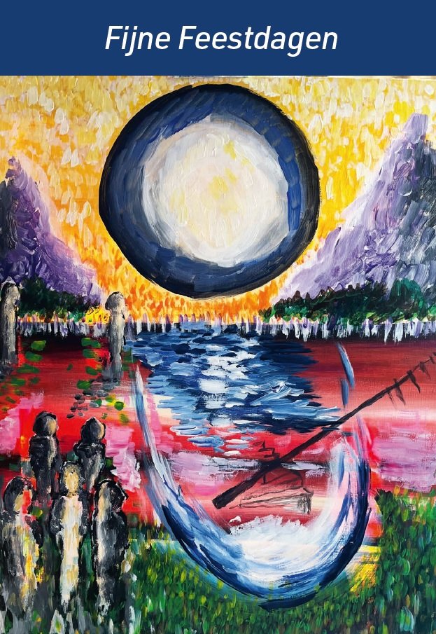 Het schilderij voor deze kerstkaart en ook het gedicht zijn door ons lid Jan van Bergen gemaakt. Daarvoor onze dank. Door parkinson was Jan zijn stem kwijt. Zijn logopediste zorgde voor herstel en inspireerde hem in die tijd bij het maken van het schilderij.
