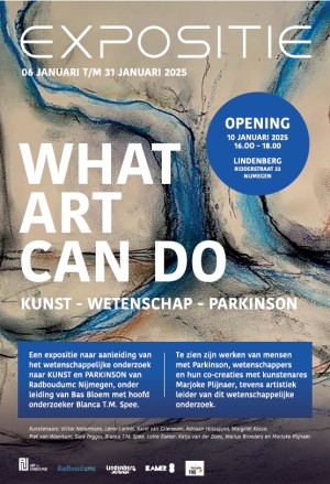 | | | | | Vacature in het bestuur van de Parkinson Vereniging We zijn nog op zoek naar een secretaris van het bestuur van de Parkinson Vereniging. Ben jij een betrokken lid, bij voorkeur met bestuurlijke ervaring, en wil je je samen met de andere bestuursleden inzetten voor onze prachtige Parkinson Vereniging? Reageer dan uiterlijk 26 januari door je CV en korte motivatie te mailen naar: nickie@parkinson-vereniging.nl | | | | | | Wat willen mensen met parkinson weten over het beloop van bijwerkingen? Bijwerkingencentrum Lareb deed onderzoek naar wat mensen willen weten over het beloop van bijwerkingen. In een infographic toont Lareb de resultaten. | | | | | | What art can do De tentoonstelling 'What Art Can Do' neemt je mee in een wereld waar kunst en wetenschap samenkomen. De kunstwerken zijn in co-creatie gemaakt door mensen met de ziekte van Parkinson in samenwerking met Art Unbound. Elk kunstwerk vertelt een uniek verhaal: over de impact van Parkinson, de kracht van creativiteit en de rol van kunst bij inzicht, expressie en verbinding.
