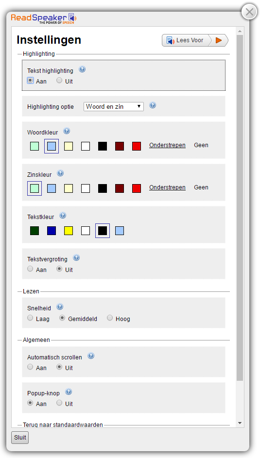 - Kiezen voor de pop-up voorleesknop als tekst geselecteerd wordt