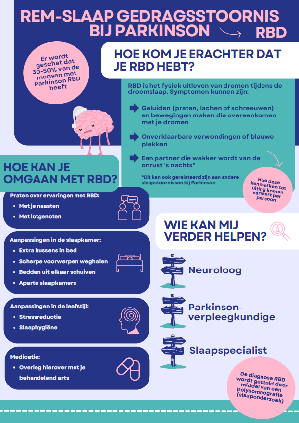 RBD is de afkorting van REM‑slaap gedragsstoornis. Dit gebeurt tijdens de REM‑slaap, ook wel de droomslaap genoemd. REM betekent Rapid Eye Movement, oftewel snelle oogbeweging.